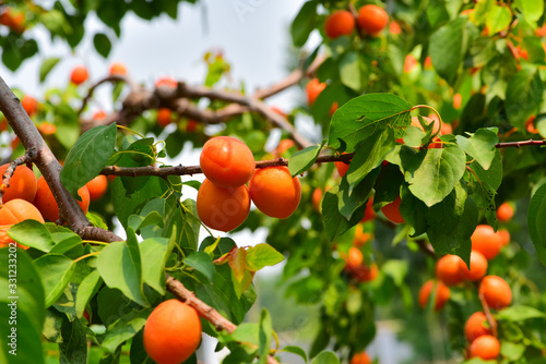 The apricot trees are covered with fresh apricots at harvest time