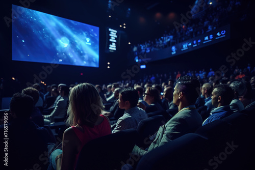 The audience gathers in the conference hall for a business conference and presentation.