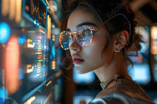 The beautiful woman with glasses is using holographic screens and AI technology to shop online from the comfort of her futuristic home, surrounded by robotic assistants