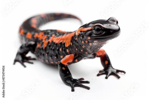 the beside view Eastern Red-backed Salamander, left side view, white copy space on right, dutch angle view, isolated on white background
