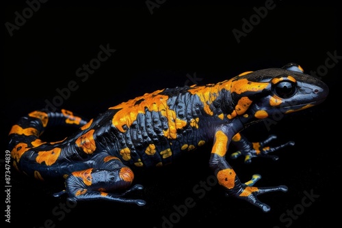 the beside view Fire Salamander, left side view, white copy space on right, isolated on black background