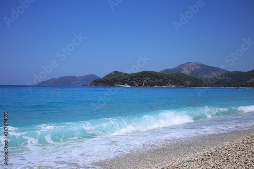 The blue stormy sea off the coast of Oludeniz in Turkey is one of the most beautiful and popular tourist destinations in Turkey.