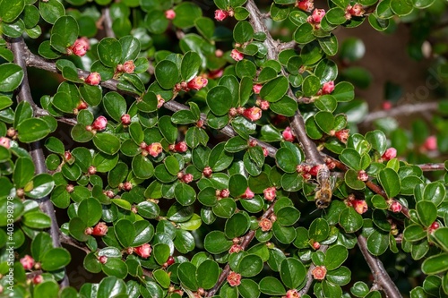 The branches of the Cotoneaster horizontalis, which bloom profusely with pink small flowers and glossy leaves