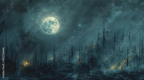 The burnt forest glowed eerily under the full moon, shadows intertwining to craft a chilling and intense ambiance.
