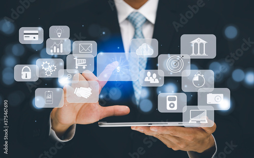 The businessman is Select the graph icon and uses a modern credit card by laptop or smartphone.shopping online on the card and buy order shopping online.
