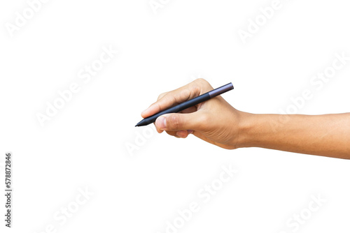 The businessman's hand holds a pen on white background, clipping path