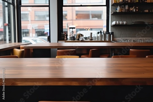 The cafe has an exuberant image with a wooden, empty table. (Generative AI)