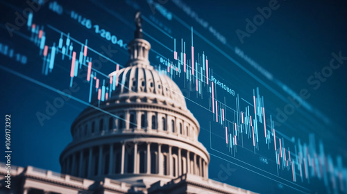 The Capitol Building against a deep blue sky, with digital candlestick charts and economic data floating across the image.