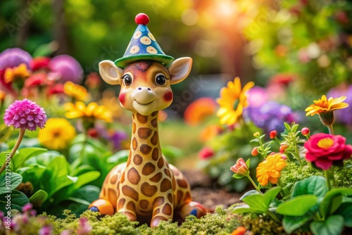 The charming giraffe gnome figurine, enveloped by vivid garden flowers and lush greenery, brings a whimsical touch to