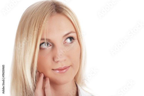 The cheerful charming blonde in a white shirt