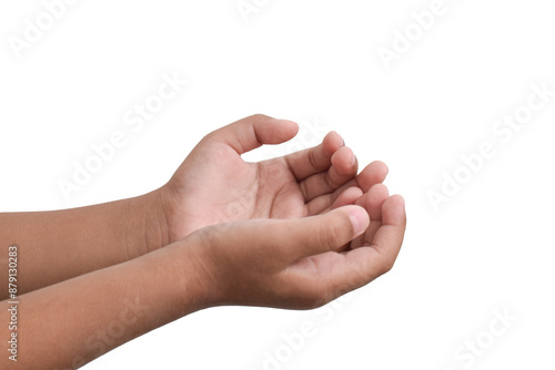 The child's palms are open, the child's hands are in a prayer position or the child's hands are open empty to ask for something