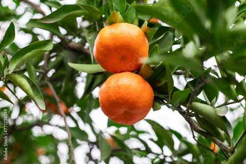 The citrus trees in the citrus orchard hang ripe citrus fruits
