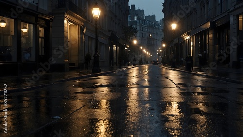 The cityscape alive with flickering streetlights mirrored in rain-slicked pavements ai_generated