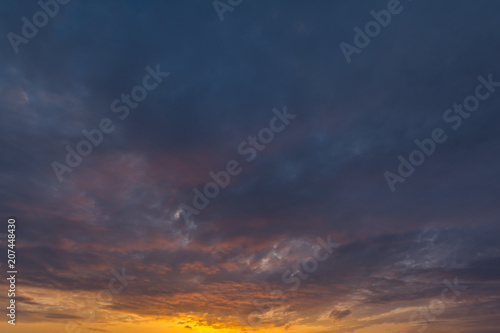 The clouds in the sky are colored by the sun at dawn.