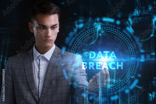 The concept of business, technology, the Internet and the network. A young entrepreneur working on a virtual screen of the future and sees the inscription: Data breach