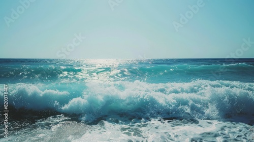 the concept of World Ocean Day. Beautiful nature landscape. World Water Day. A vast ocean with waves, turquoise water, and a clear sky in the distance.