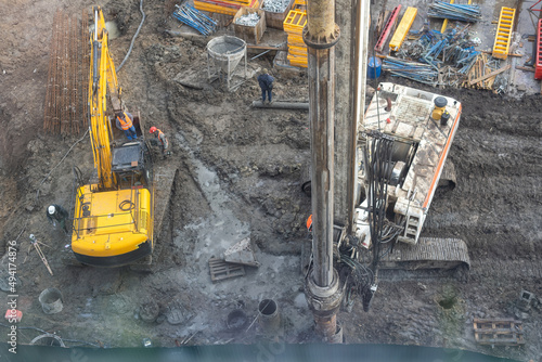 The construction process of a residential complex. Many high-rise cranes against the background of new buildings