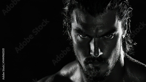 The determined man stares intently at the viewer with a serious expression
