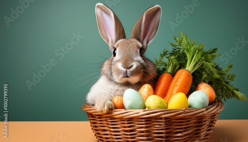 The Easter bunny holding carrots in a basket of colorful Easter eggs.