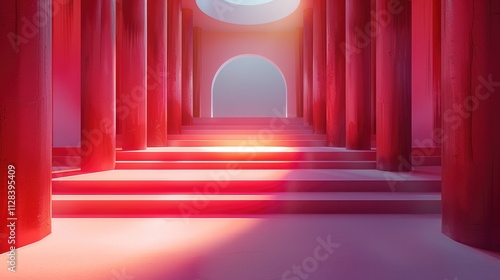 The fashion show stage is designed with red wall and light pink floors, featuring an oversized gradient pattern of geometric shapes. The layout features steps leading to the center of the composition.