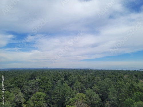 The foreground is a dense forest, various shades of green trees. The background reveals a lighter, almost hazy, sky with scattered, fluffy, white clouds, against which the darker blue sky is visible.