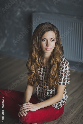 The girl sitting in the Lotus position on the parquet floor 6953