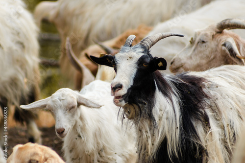 The goat in the sheepfold in Prahova, Romania. goats raised naturally in nature grazed on the hills of Romania.
