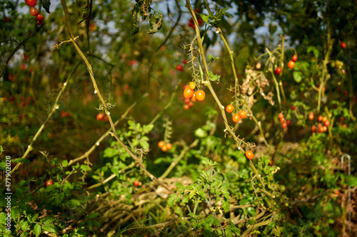The growing tomatoes in the greenhouse.