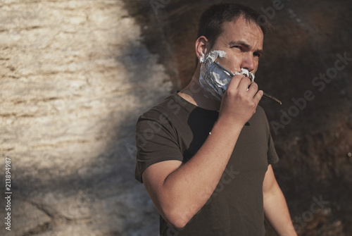 the guy is shaving at the waterfall with a dangerous razor