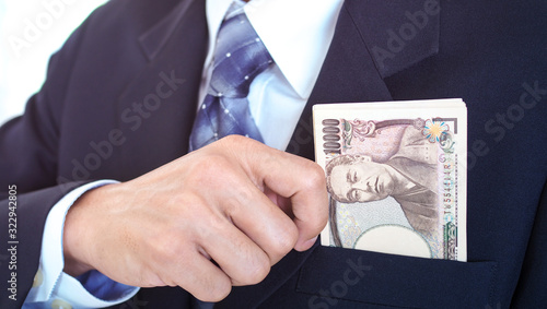 The hand of a business man catching money in a suit bag . Investment guidelines for business profits.