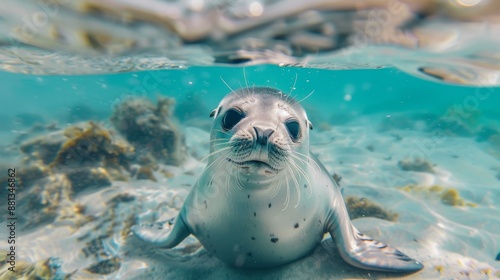 The head of a baby seal submerged in water, with a vibrant underwater landscape , horizontal Composition, product view, Centered Composition, masterpiece, best quality, highly detailed.