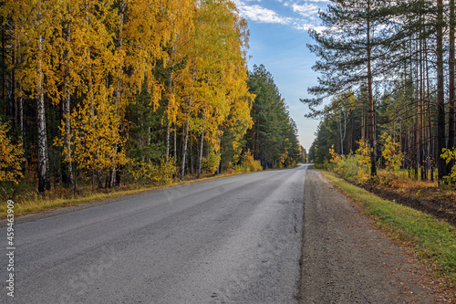 The highway passes through the autumn forest
