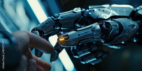The human finger delicately touches the finger of a robot's metallic finger