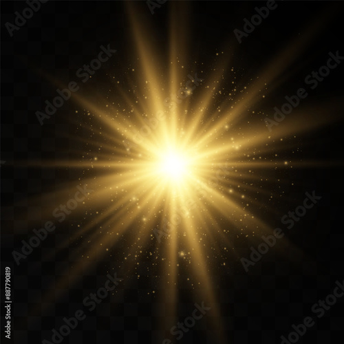 The image depicts a golden light , including sun rays and a dawn effect. The image also includes a gold flare
