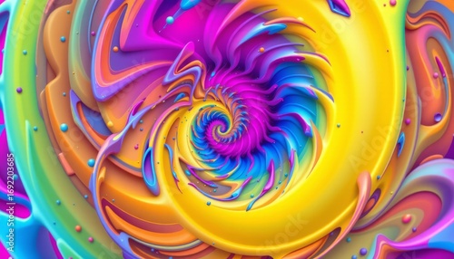 The image features a vibrant, swirling spiral pattern with an explosion of bright colors including purple, yellow, blue, green, and pink