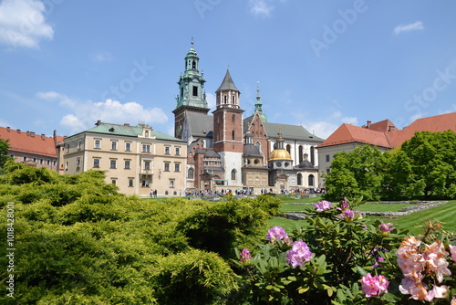 The image shows a beautiful view of Wawel Cathedral in Kraków, Poland. The iconic Gothic architecture, including the golden dome of Sigismund's Chapel, stands out against a bright blue sky