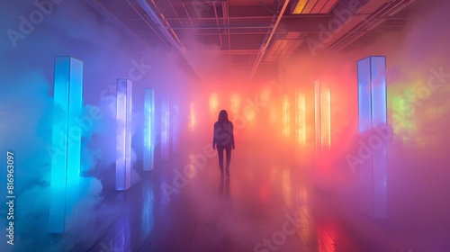 The image shows a mysterious figure walking through a dark and colorful tunnel. The figure is illuminated by the glowing lights on the walls.