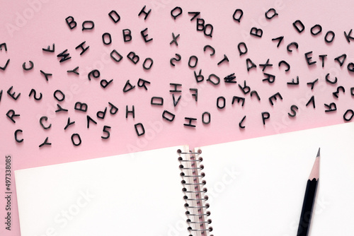 The letters are in disorder, a clean notebook and a pencil for writing. Creative writing concept. Grammar and languages