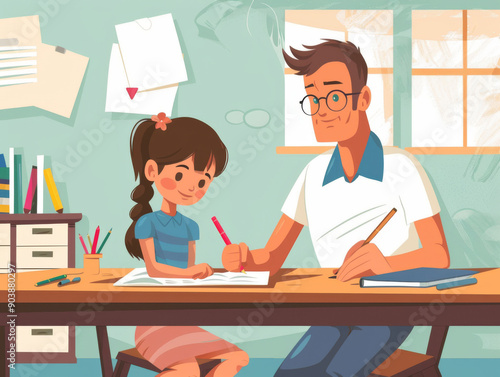 The man is helping the girl write something, doing homework