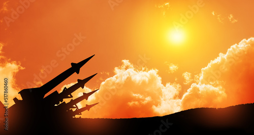 The missiles are aimed at the sky at sunset. Nuclear bomb, chemical weapons, missile defense, a system of salvo fire.