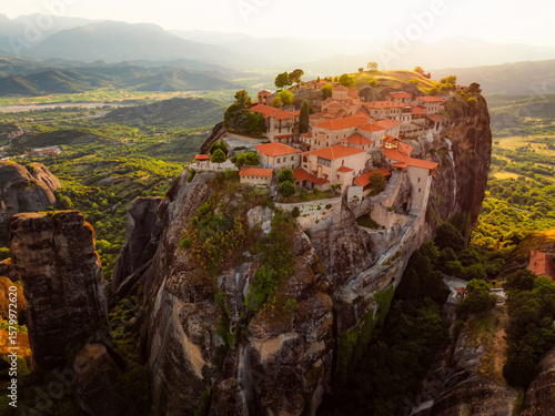 The monastery Meteora, aerial rocky monasteries complex in Greece near Kalabaka city. Holy Monastery of the Great Meteoron and Varlaam