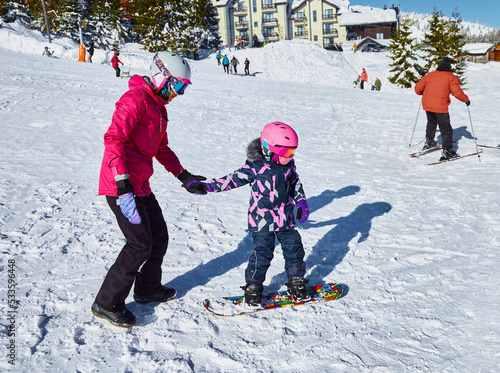 The mother teaches his daughter to snowboard. Woman helping and support child ride on snowboard on ski resort at sunny winter day, travel vacation, landscape mountains background.