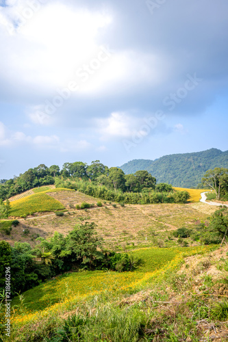 The Orange daylily(Tawny daylily) flower farm at chih-ke Mountain(chi ke shan) with blue sky and cloud, Hualian , Taiwan