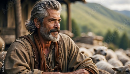 The Pastoral Scene Where the Shepherd, Adorned in Traditional Attire, Sits in Front of a House, Overseeing His Flock of Sheep Grazing Peacefully in the Lush Countryside. Enjoying Retirement.
