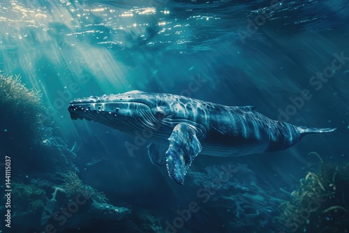 The picture of the blue whale is swimming in the ocean with the bright light of the sun, blue whale is the largest mammal animal known to have ever existed, both in terms of length and weight. AIG51.