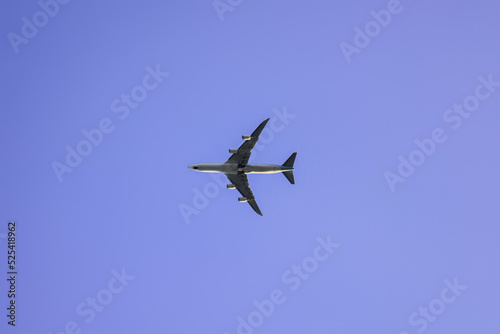 The plane flies against the blue sky. Travels.