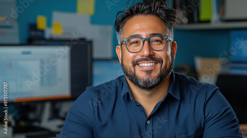 The portrait features a confident engineer smiling while presenting technical plans in a sleek office environment.