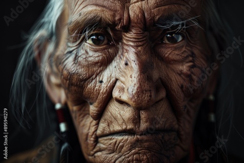 The portrait is of an old native american male on a dark background, using generative artificial intelligence
