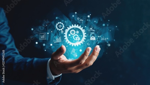 The power of innovation, held in the open hand, showcases gears and icons with a surreal glow. Represents technological advances and concepts, with a focus on the future.