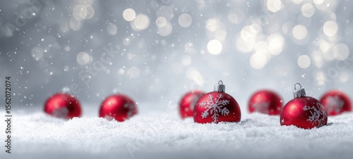 The red Christmas ornaments scattered across the snowy landscape creating a festive ambiance.